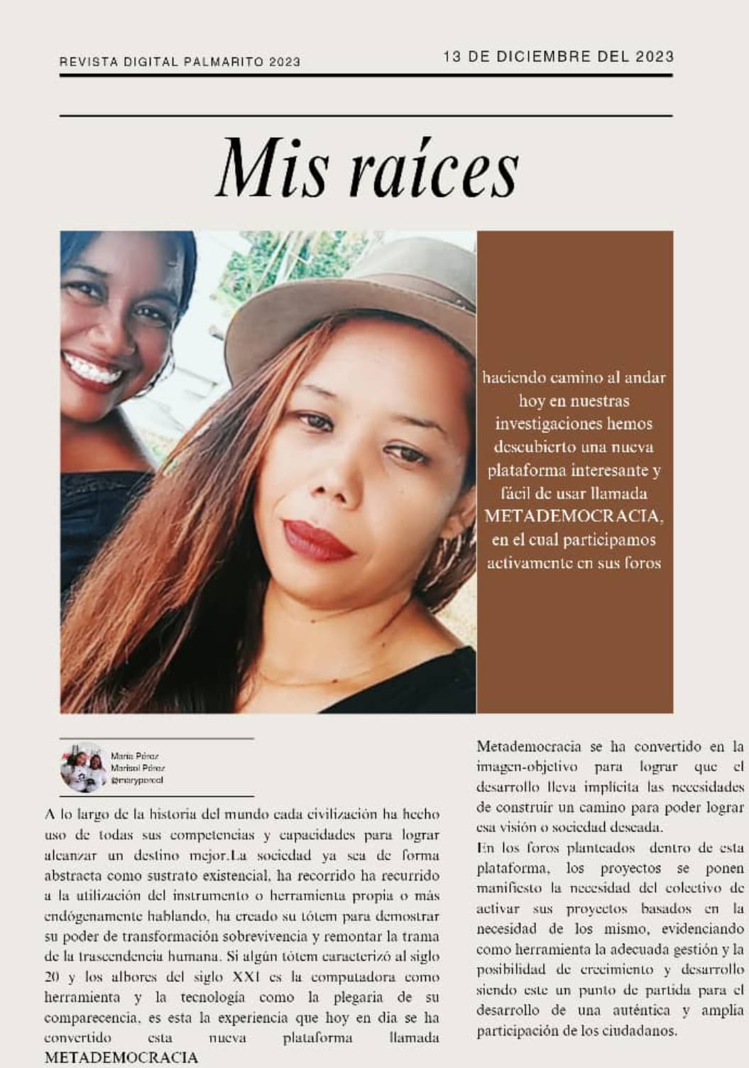 Les dejo acá dos páginas de mi revista digital que es mi proyecto y bebé más preciado que habla del metademocracia, y les dejo un invitación a un pequeño reinado a las ferias de san benito en la Comunidad de Palmarito, allí participarán otro de.mis proyecto que llevo con mis hermanas el grupo de danza, canto y teatro vía online se transmitirá por Instagram @marypercol